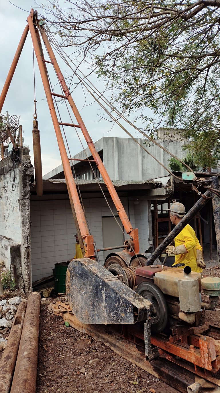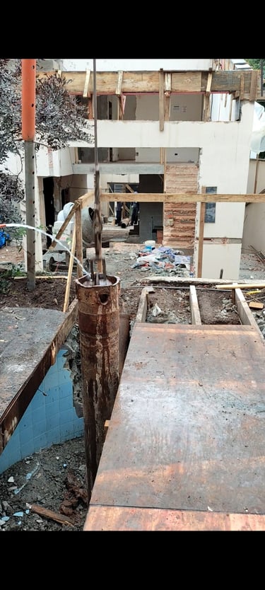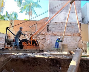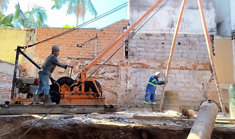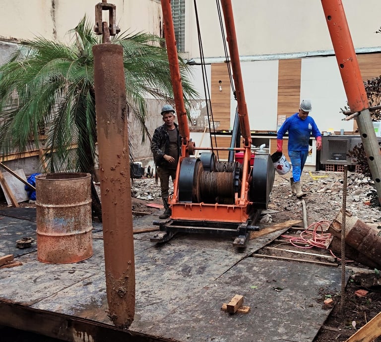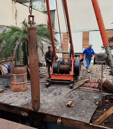 Especialistas em fundações com a máquina bate-estaca Strauss, atuando em terrenos difíceis e úmidos com precisão e segurança.