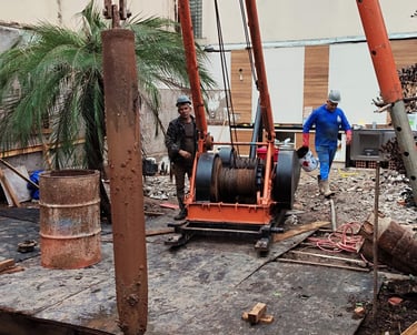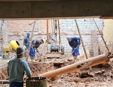 Especialistas em fundações com a bate-estaca Strauss, perfeita para terrenos úmidos e acidentados, garantindo segurança e estabilidade.